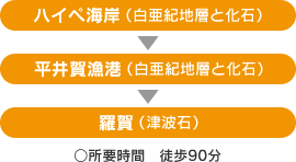 田野畑の海岸線には、すぐそばまで近づき、直接手でふれて形や大きさを確かめられるジオサイトがいっぱい! 億年・万年単位の時間と空間をタイムスリップしているような感覚を楽しんでみましょう。