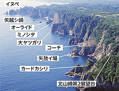 田野畑にはアイヌ語が語源と思われる「地名」、そして個々の岩や浜辺そして岬などを示す「名称」がいたるところにあります。名付けられた時代背景などは詳しく研究されておらず不明ですが、今でも地元の人たちが特定の場所や漁場の地点を示す場合などに日常的に使われています。