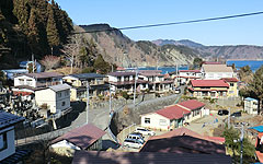 島越地区の海沿いの高台は、山肌に沿って家々が建ち並び、狭く急な坂道や階段そして迷路のような路地が生活道路となっており、神社や小さな祠が多く見られるなど昔からの漁村の生活を感じ取ることができます。同様の漁村風景は平井賀地区や羅賀地区でも見られましたが、平成23年3月11日の津波により大半が流失してしまいました。