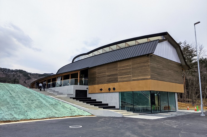 岩手県産のアカマツをふんだんに使用した明るい建物は、田野畑村でよく見られる牛舎の形をモチーフにしたもの。かなたに太平洋を望むことができ、雄大な海成段丘の高みにいることを感じられます。
