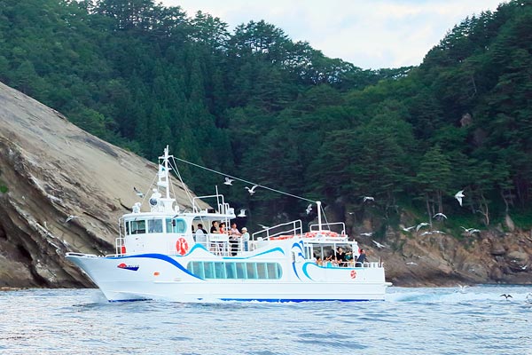 島越港から「SUN RIKU GO(三陸号)」に乗って、北山崎の断崖下までぐるりと一周。約50分かけて、田野畑の海の大パノラマを楽しめるクルーズ船です。